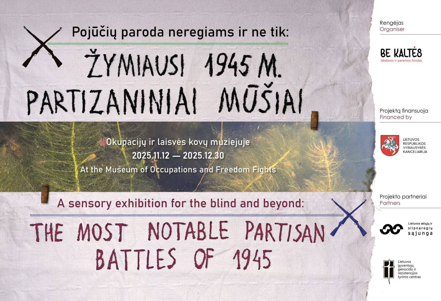 Nuo lapkričio 12 d. muziejuje veiks pojūčių paroda neregiams ir ne tik „Žymiausi 1945 m. partizaniniai mūšiai“. Joje pamatysite dešimties 1945 m. vykusių partizanų mūšių interpretacijas meninėse instaliacijose.